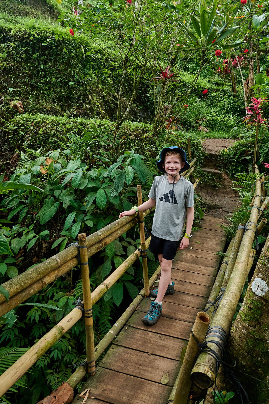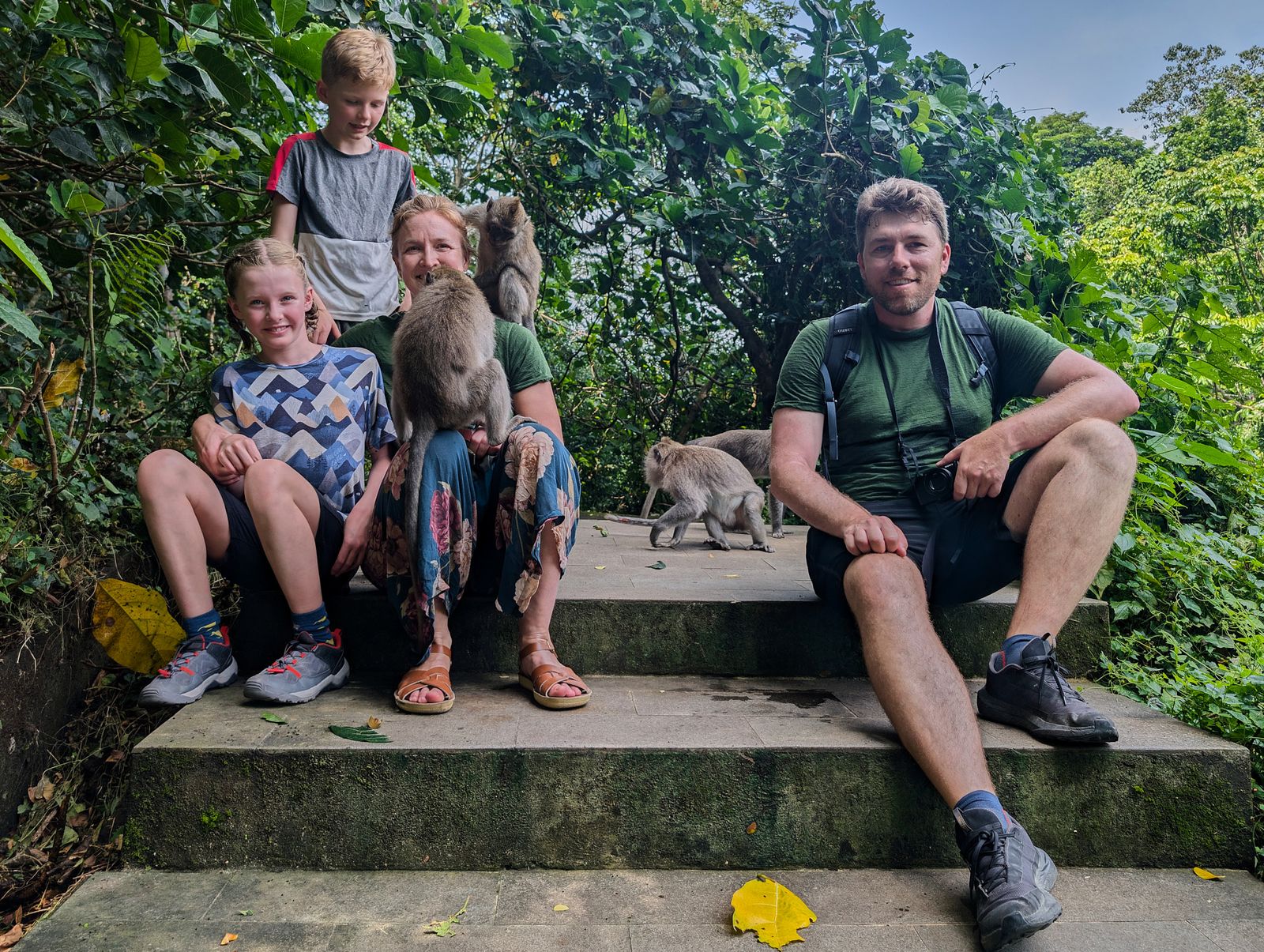 Until I told the kids and Mylène to sit on some stairs so I could take a photo. A monkey jumped straight onto Mylène’s lap and started trying to open her purse. Then he hopped onto my head and refused to get off. The guidelines say to “stay calm and walk away,” which sounds great in theory, but that bastard was glued to my skull. I eventually bent down and took off my backpack, and he finally bailed.