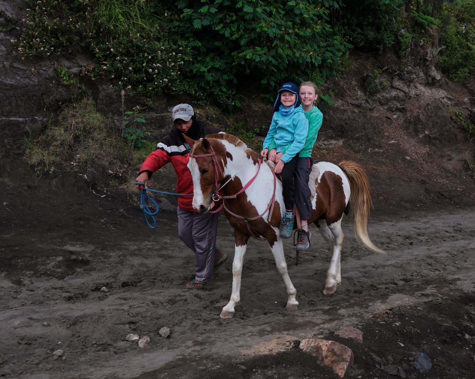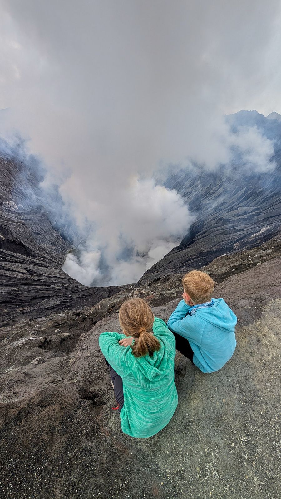 Our driver stopped for what he called a “hike,” and only then did I fully realize that Mount Bromo is very much an active volcano—and we were about to walk right up to its smoking crater rim. As soon as we parked, we were swarmed by people offering horse rides to the stairs. It was pricier than we wanted, so I decided to walk, much to Teddy’s disappointment. The first stretch was flat, then it turned into a steep climb—made much harder by the 2,000-meter elevation. Just as I was bracing myself for Teddy’s complaints, a man magically appeared offering both kids a horseback ride for five dollars. Yes, please! After a long, seemingly endless staircase, we reached the rim—and WOW. Peering into an active volcano, with smoke billowing out and even lava visible at the bottom, was mind-blowing. The kids were thrilled, and honestly, so were we.