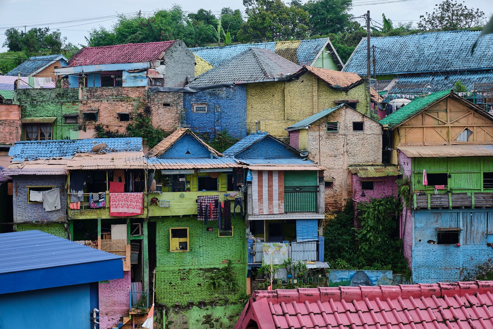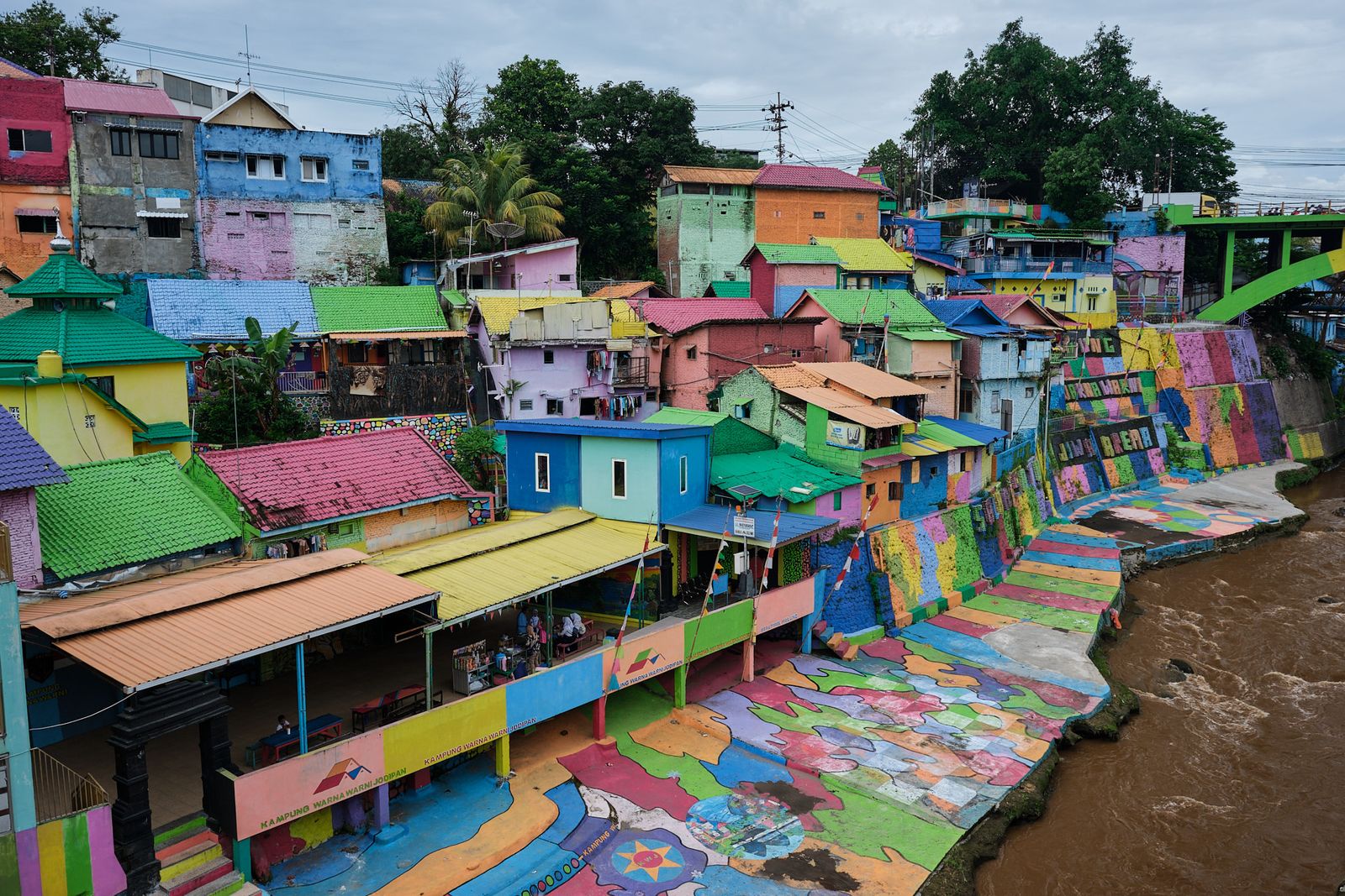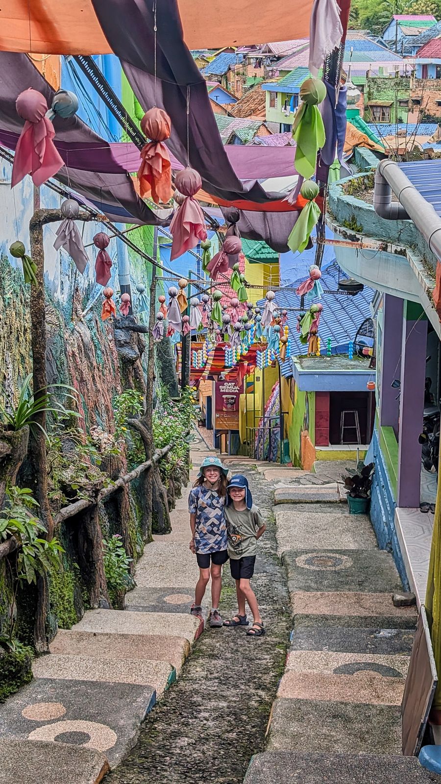 Next up was Malang itself. We visited Jodipan Village, just outside the city center. Once a very poor and rundown area, it was transformed by a student project into an explosion of color and street art. The makeover has drawn tourists from all over, improving local income and motivating residents to keep the area clean. On one side, houses are painted every color imaginable; on the other, the entire neighborhood is painted blue—Kampung Biru Arema.