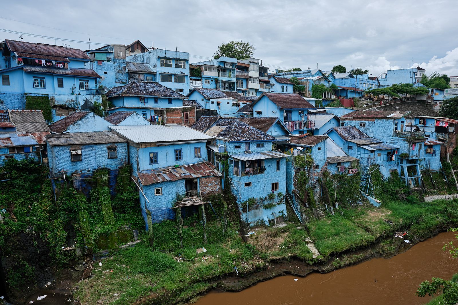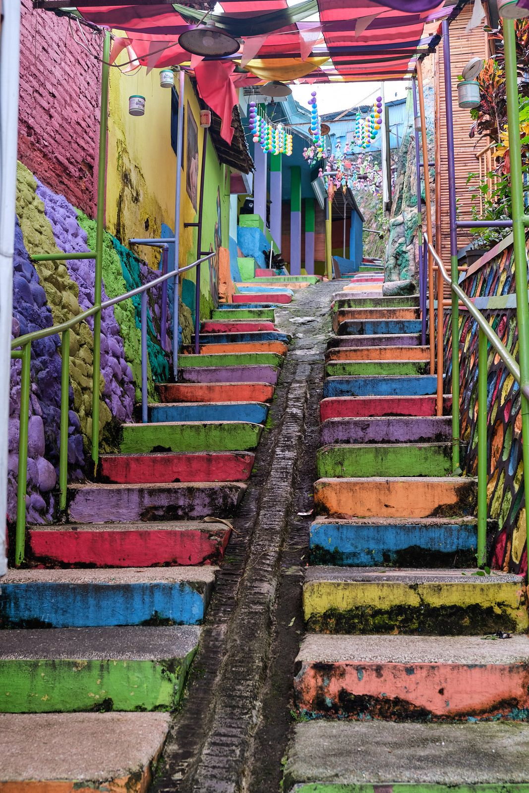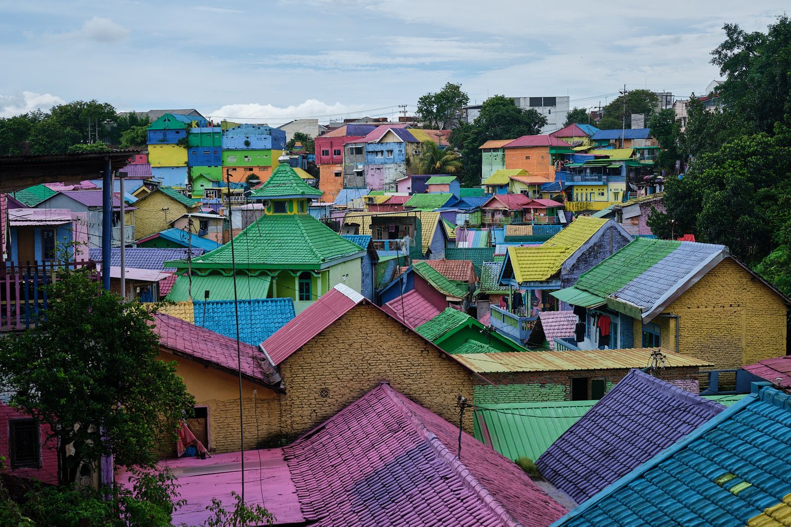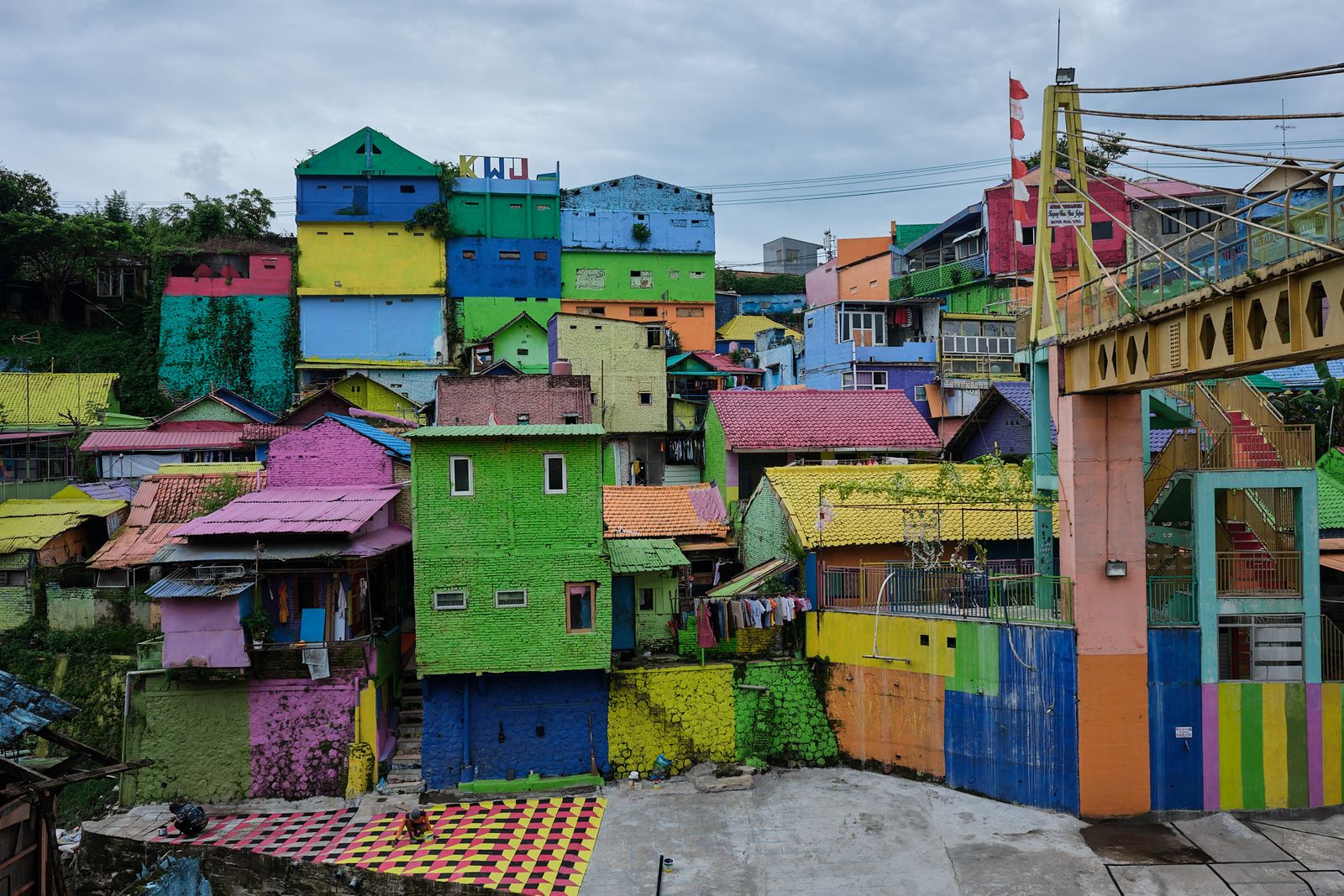Next up was Malang itself. We visited Jodipan Village, just outside the city center. Once a very poor and rundown area, it was transformed by a student project into an explosion of color and street art. The makeover has drawn tourists from all over, improving local income and motivating residents to keep the area clean. On one side, houses are painted every color imaginable; on the other, the entire neighborhood is painted blue—Kampung Biru Arema.