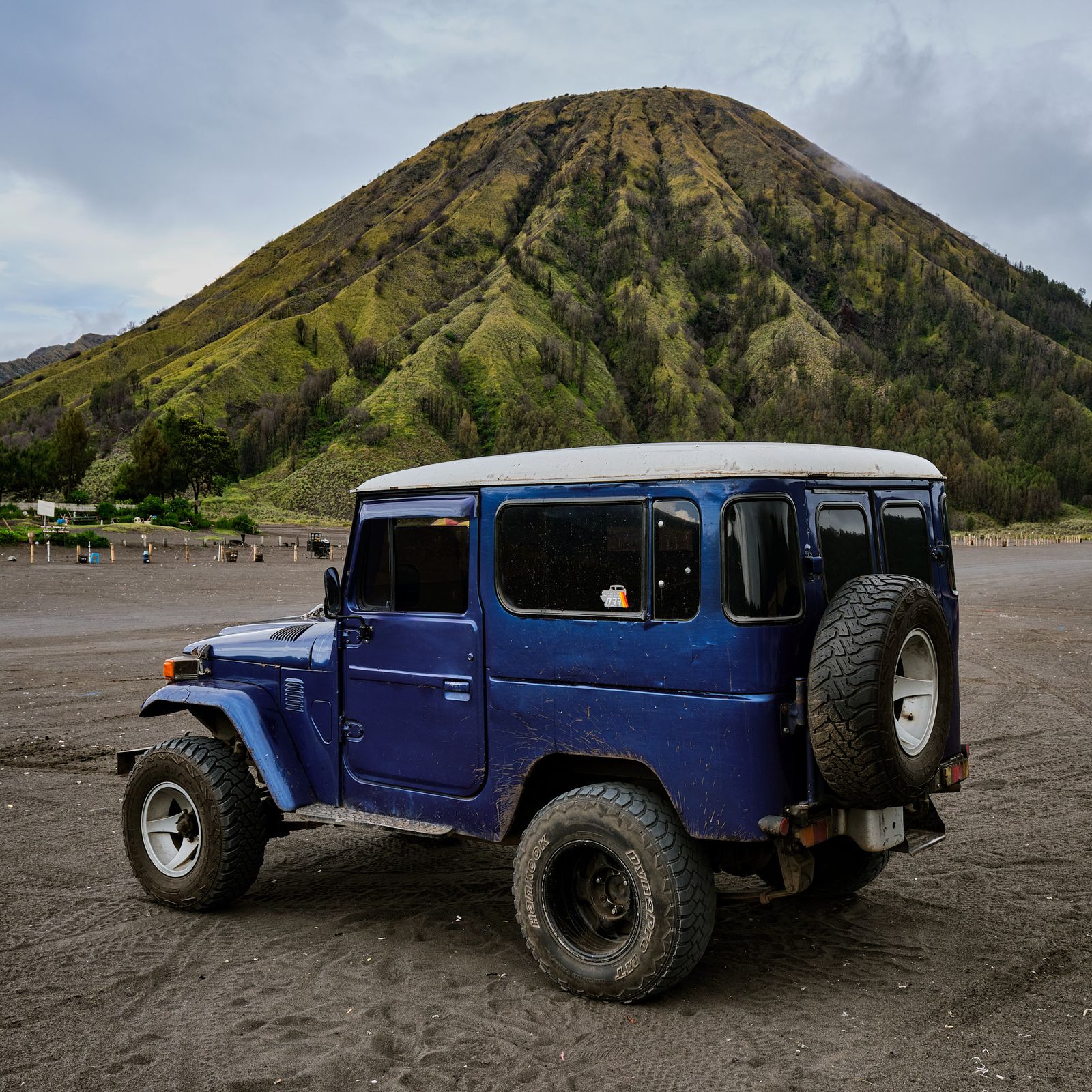 Then we entered Bromo–Tengger–Semeru National Park, and suddenly the jeep made sense. The park is a vast, 10-km-wide sea of black volcanic sand surrounded by towering caldera walls. The “roads” are just sandy tracks full of potholes and water crossings, framed by surreal green, wavy mountains. Clouds drifted in and out, but whenever the landscape appeared, it felt like we had landed on another planet.