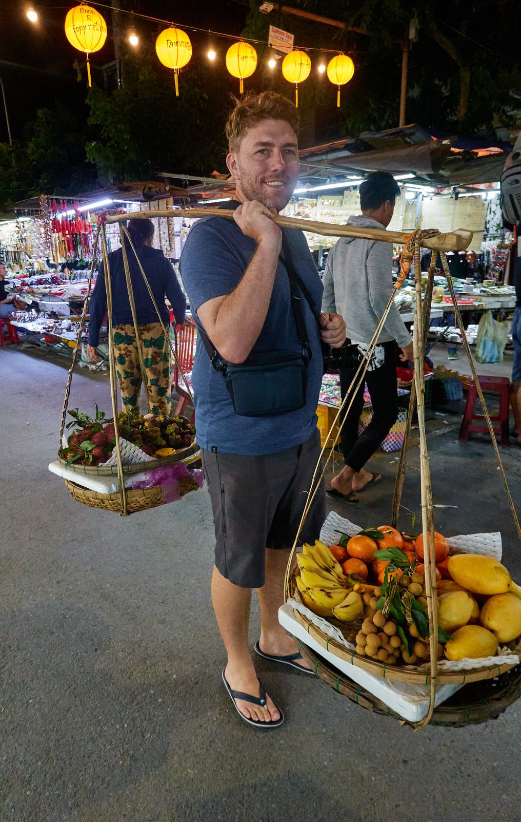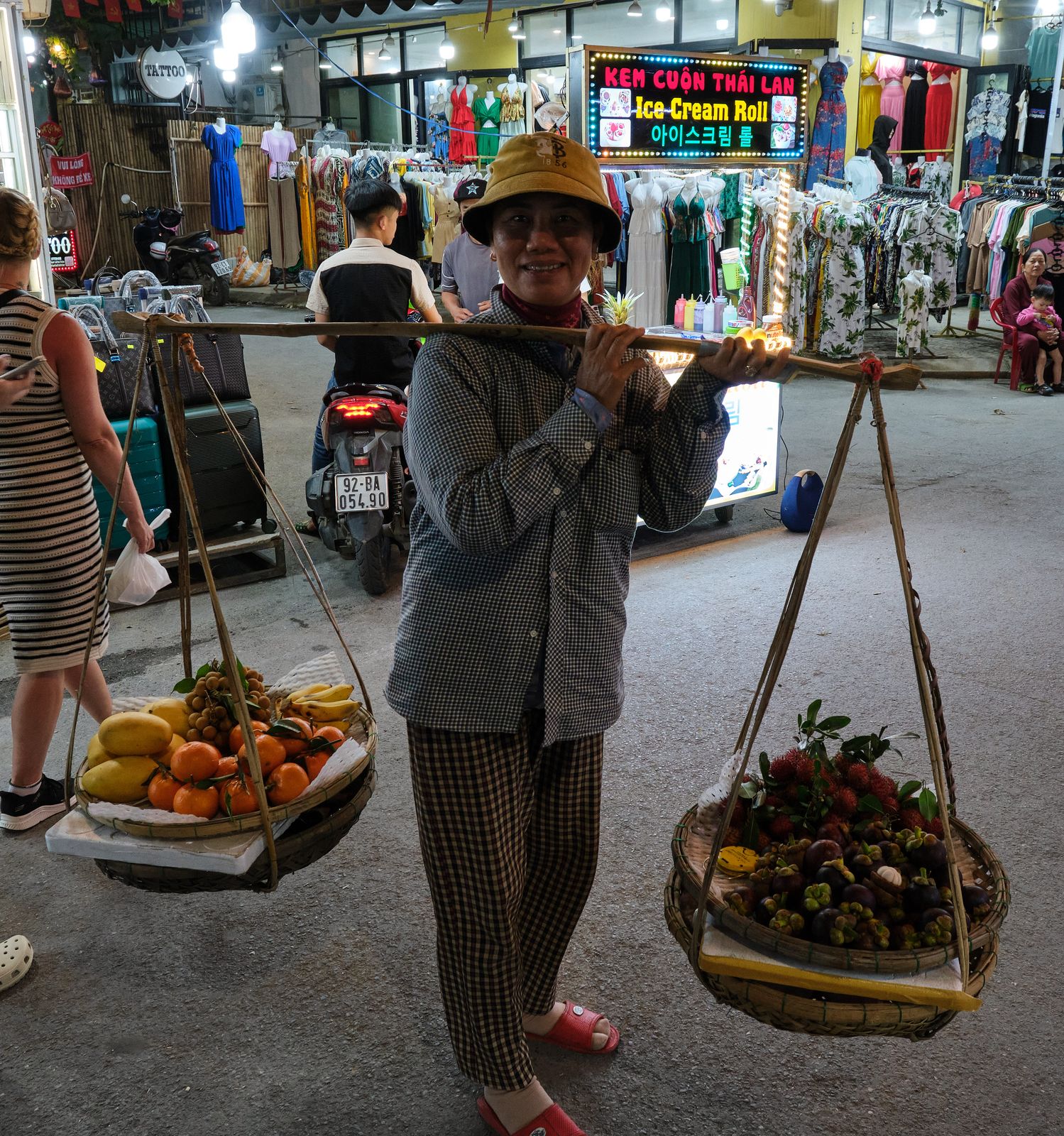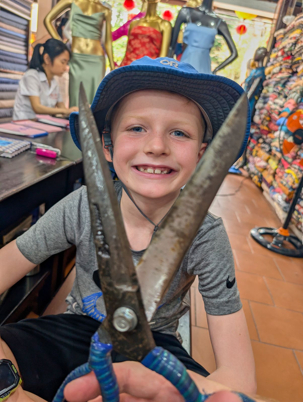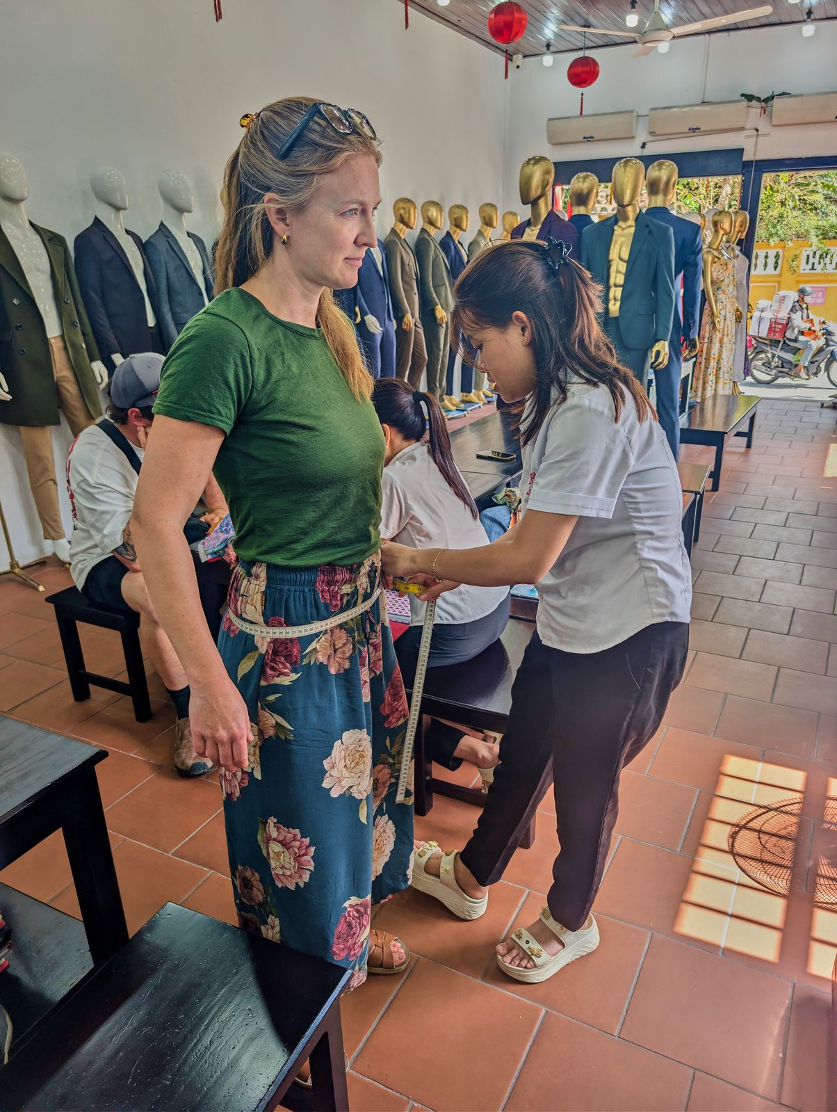 The next day, we spent hours wandering through the Old Town. Many streets are closed to traffic for most of the day, making it easier to explore on foot. I was completely mesmerized by the colorful buildings, the lanterns everywhere, and the flowers and decorations being put up for the upcoming Tết celebration. We strolled along the canals, popped into shops, and soaked it all in. At one point, we stepped into a tailor shop that had been recommended to us. We had zero intention of buying anything. We are still traveling for months, after all. And yet… 30 minutes later, we were being measured. Not even 30 hours, and a few fittings later, Joey walked out with a custom suit, and I left with a vest and jacket. It’s wild. It’s affordable. It’s incredibly well made. They literally make anything you want. My mind was blown.