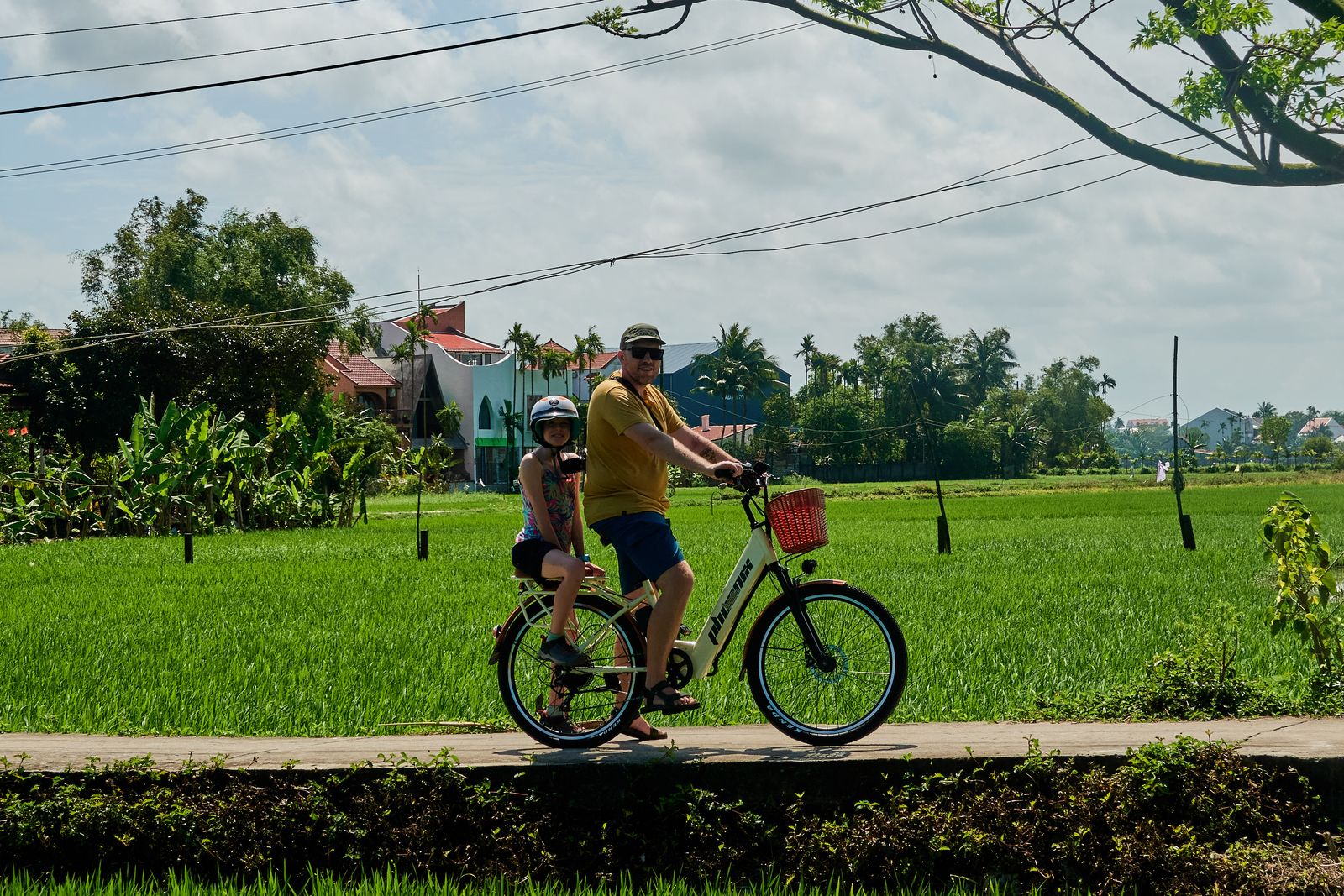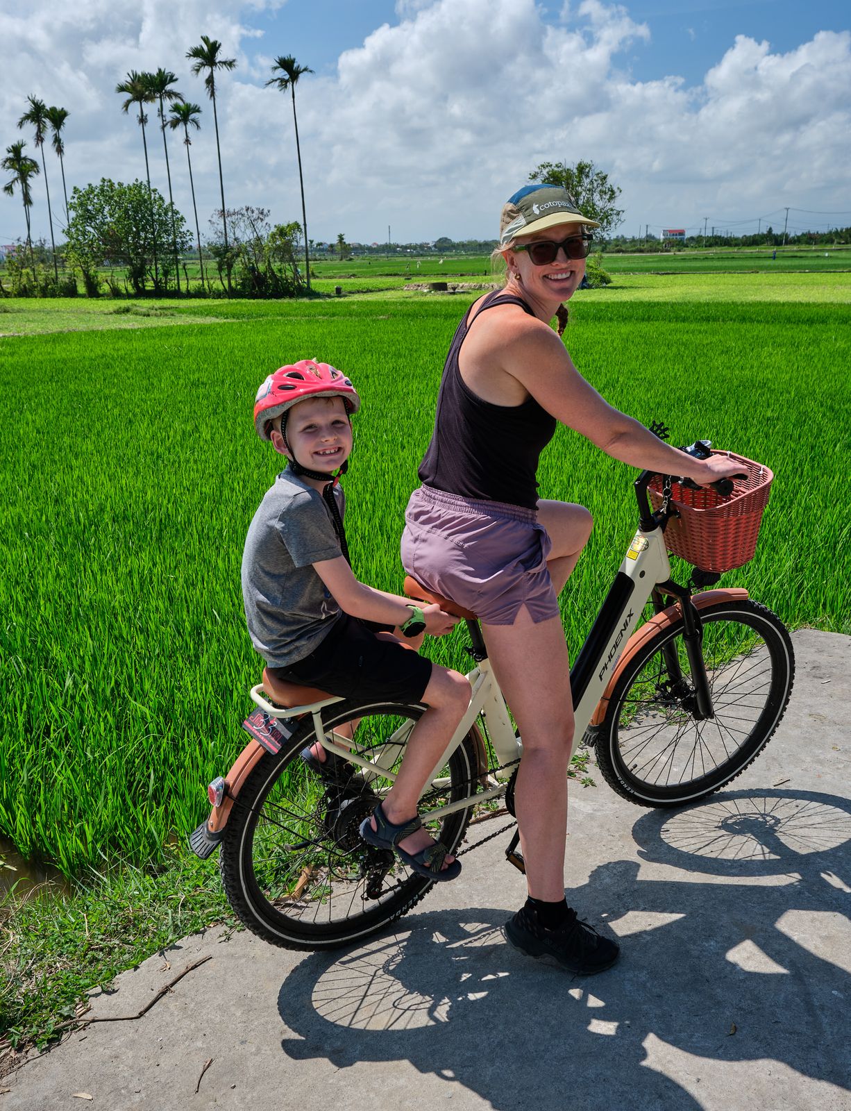 For our last day, we rented bikes to explore outside the city. And by “rented bikes,” I mean we paid $5 for an ELECTRIC bike for the entire day. Yes. Five dollars. For the whole day. I still don’t understand. The only downside? No kids’ bikes. So we rented two electric bikes with cushions and footrests on the back for the kids. Cycling through the city traffic was… stimulating. But soon enough, we were out in the rice fields, and everything became peaceful.