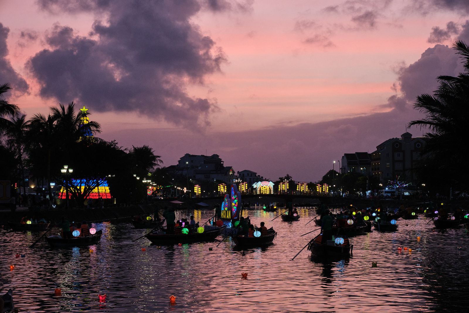 That evening, we returned to the canal for sunset — and it was magical. Thousands of lanterns lit up the streets. Boats floated along the river while people released small paper lantern-candles onto the Hoài River for good luck and tradition. It felt like stepping into another world.