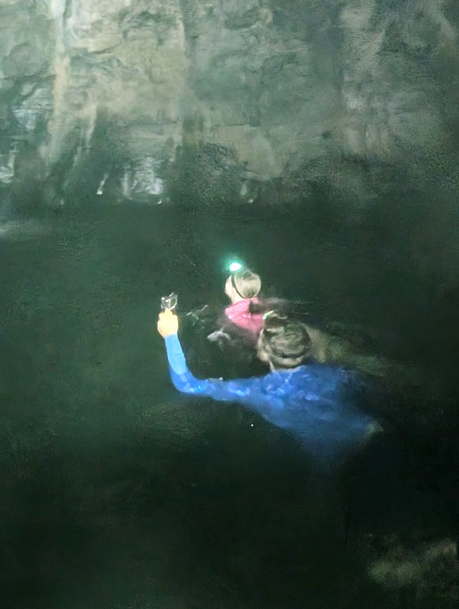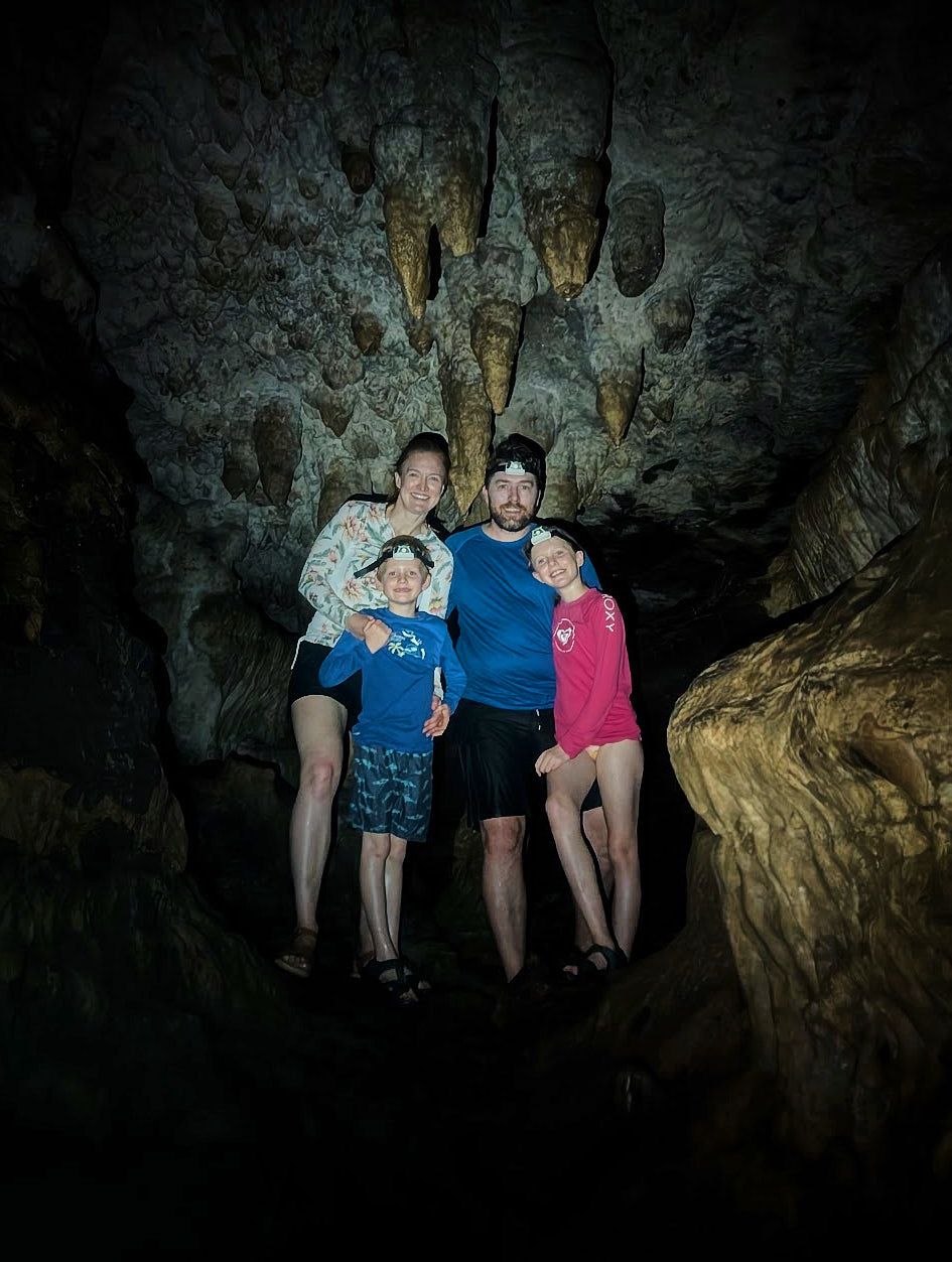 We put on bathing suits (thank goodness), strapped on headlamps, and followed our Spanish-speaking guide (our comprehension skills got quite the workout). The river cave meant walking through water, clambering over boulders, sliding through narrow passages, and even swimming under waterfalls. We learned about stalactites and stalagmites… while bats swooped overhead. The kids and I were thrilled. Joey? Let’s just say he was less excited about the bats. 🤣
