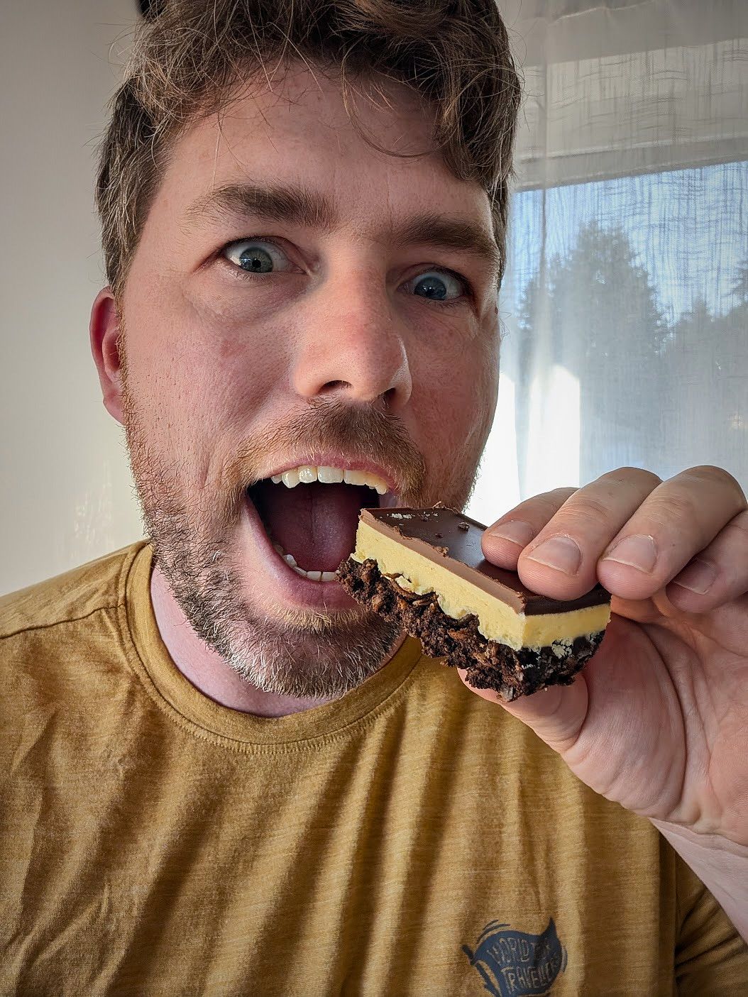 And yes, while in the Nanaimo area, we did what any self-respecting traveller would do: we ate our way through some Nanaimo bars. Joey attempted a “foodie influencer” pose for the camera. Let's just say... he's keeping his day job.