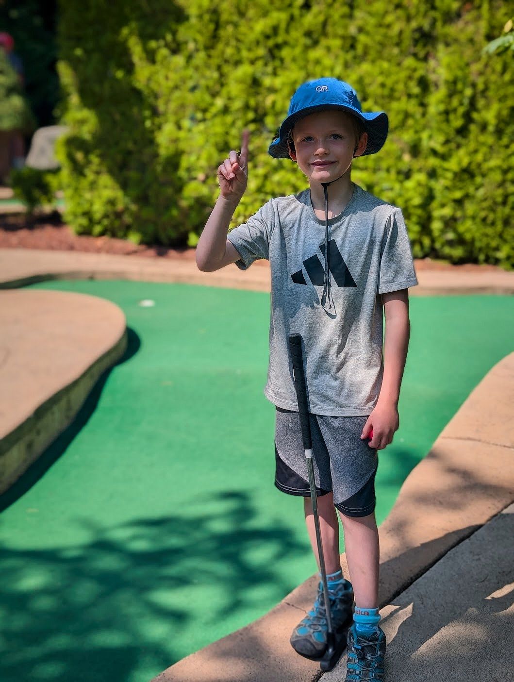 Now, for our kids, the ideal game length is exactly 10 holes. After that, they morph into tired gremlins with golf clubs. There was a moment of chaos — lost balls, emotional turbulence, snack negotiations — but after a solid pep talk and some bribery (let's call it parental motivation), the final holes were actually a blast. Teddy even landed his second hole-in-one on the last one. Cue proud parental screaming.