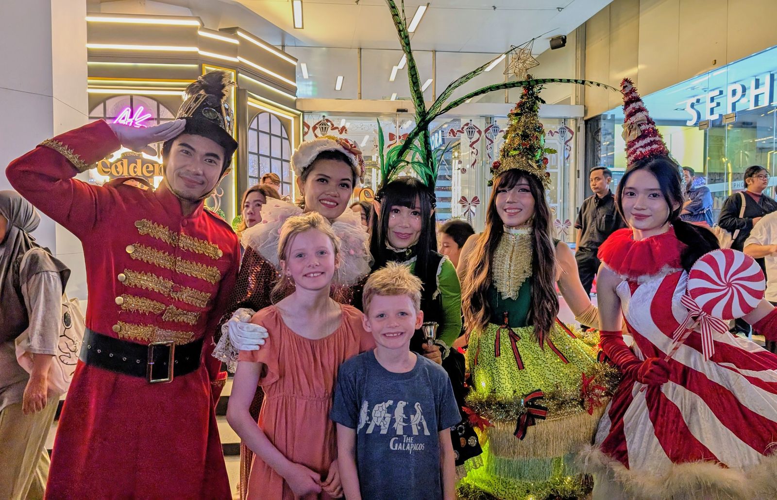 After landing, we went straight to our apartment, but didn’t even really see it because we immediately headed back out to a nearby mall for a Christmas costume parade. I hadn’t eaten much all day and was absolutely starving, which made me grumpy. Shocking, I know. The kids loved it though. Fake snow, tons of Christmas decorations, elves, etc.
