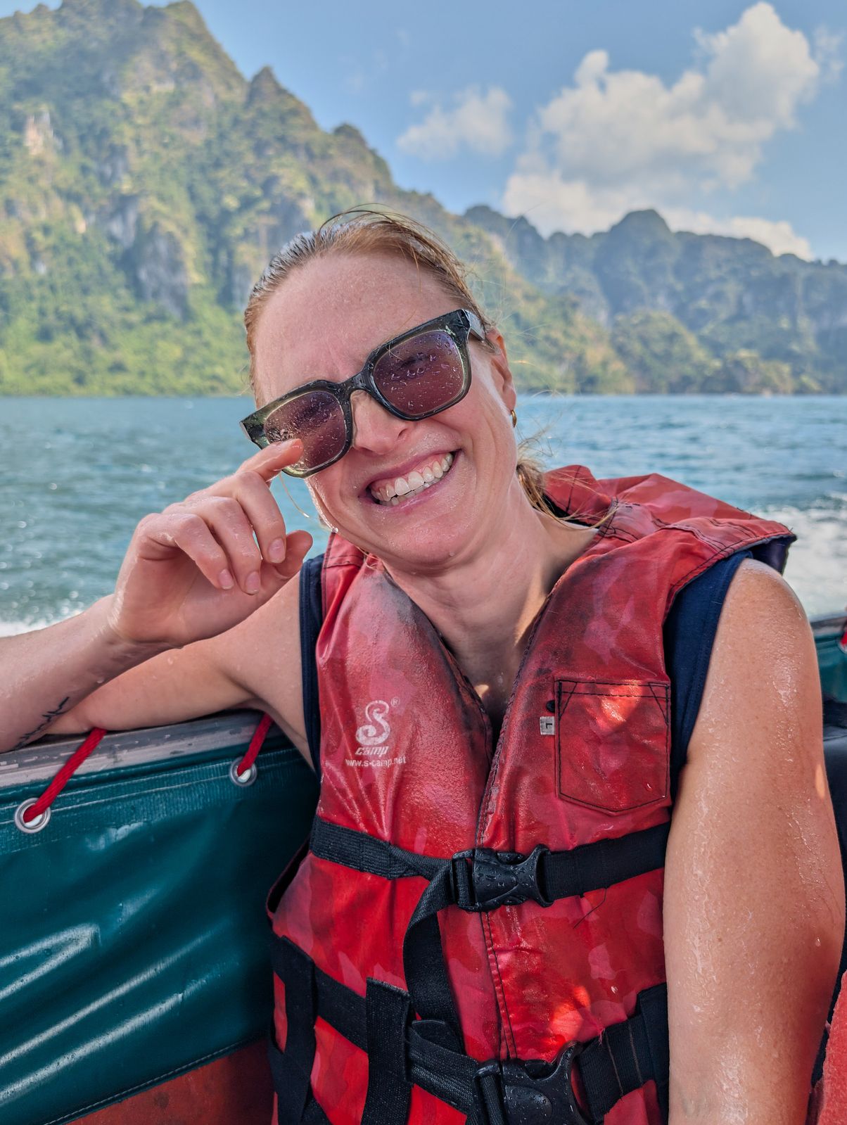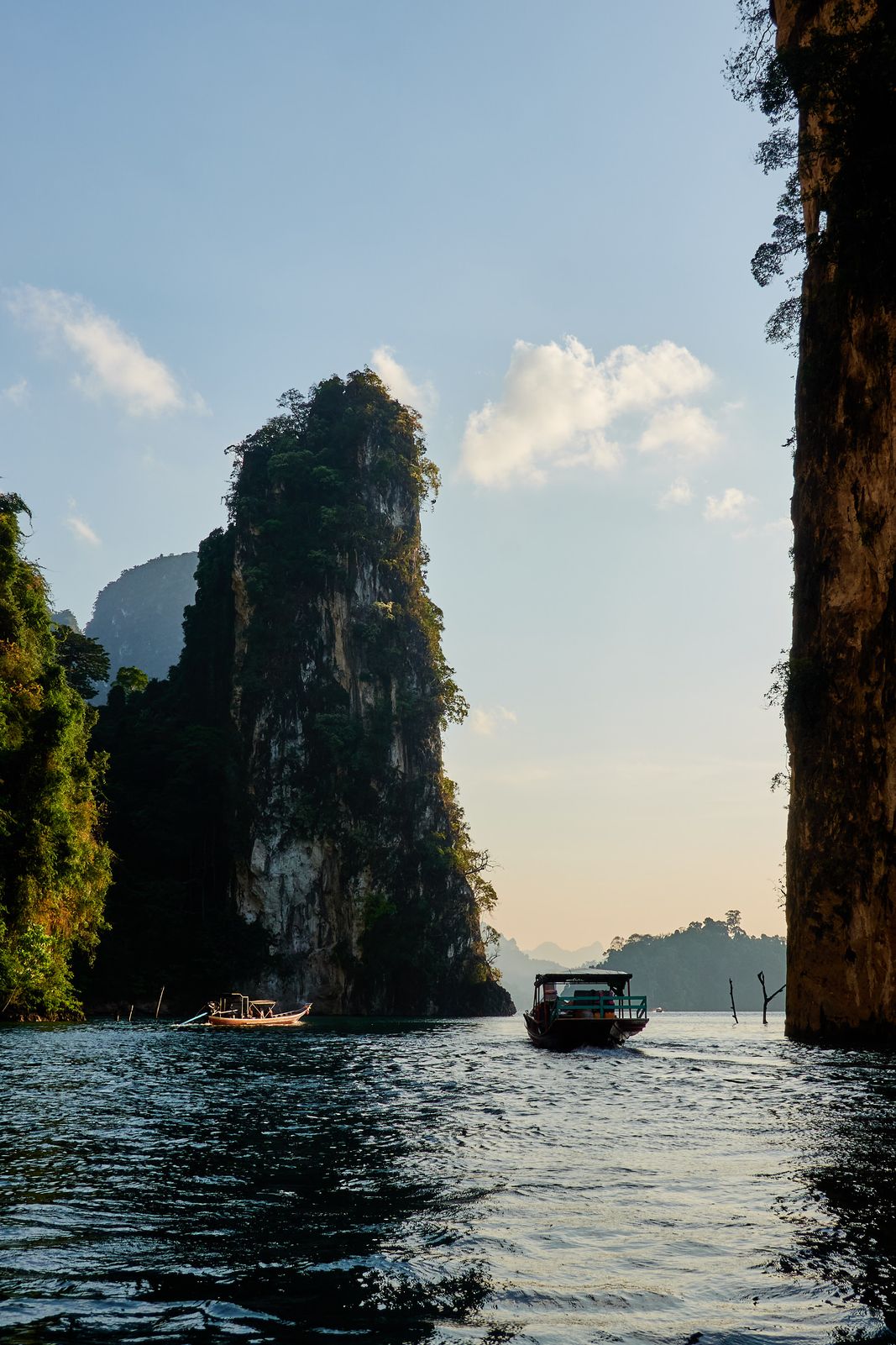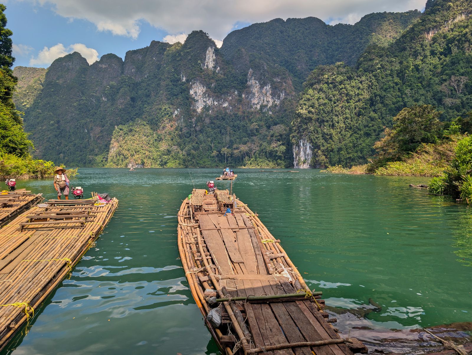 The park is centered around Cheow Lan Lake, a massive man-made lake created after a dam was built in the 1980s. Getting to our floating resort was an adventure in itself—a 45-minute ride in a long-tail boat. Picture this: sitting on what felt like a 2×4 plank, wind and waves splashing your face, the roar of a car engine in your ears. Not exactly spa vibes… but the scenery was so spectacular that we smiled, surrendered to nature, and enjoyed every second.