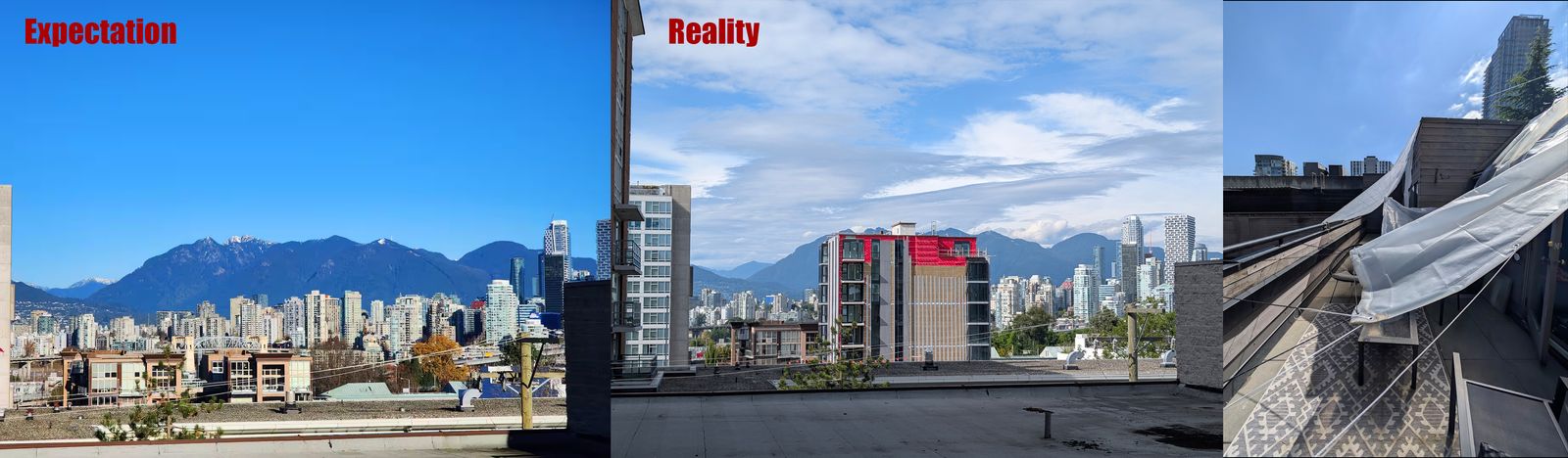 Then came our Airbnb. It was advertised as having “one of the best views of Vancouver and the mountains.” Spoiler alert: it lied. A brand-new building popped up right in the middle of the “million-dollar view,” and the owner added tarps to the balcony for maximum sadness. So instead of mountain sunsets, we got… tarp flaps. But hey, the place was big enough for our whole crew (including Joey’s parents), so we only complained a little.