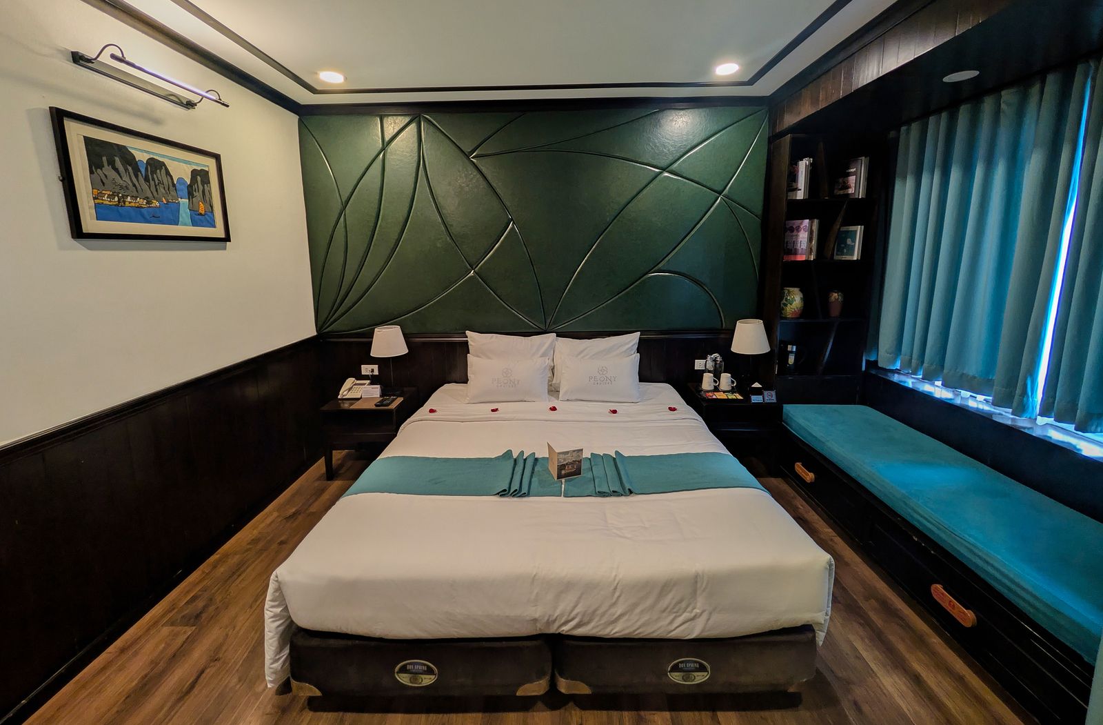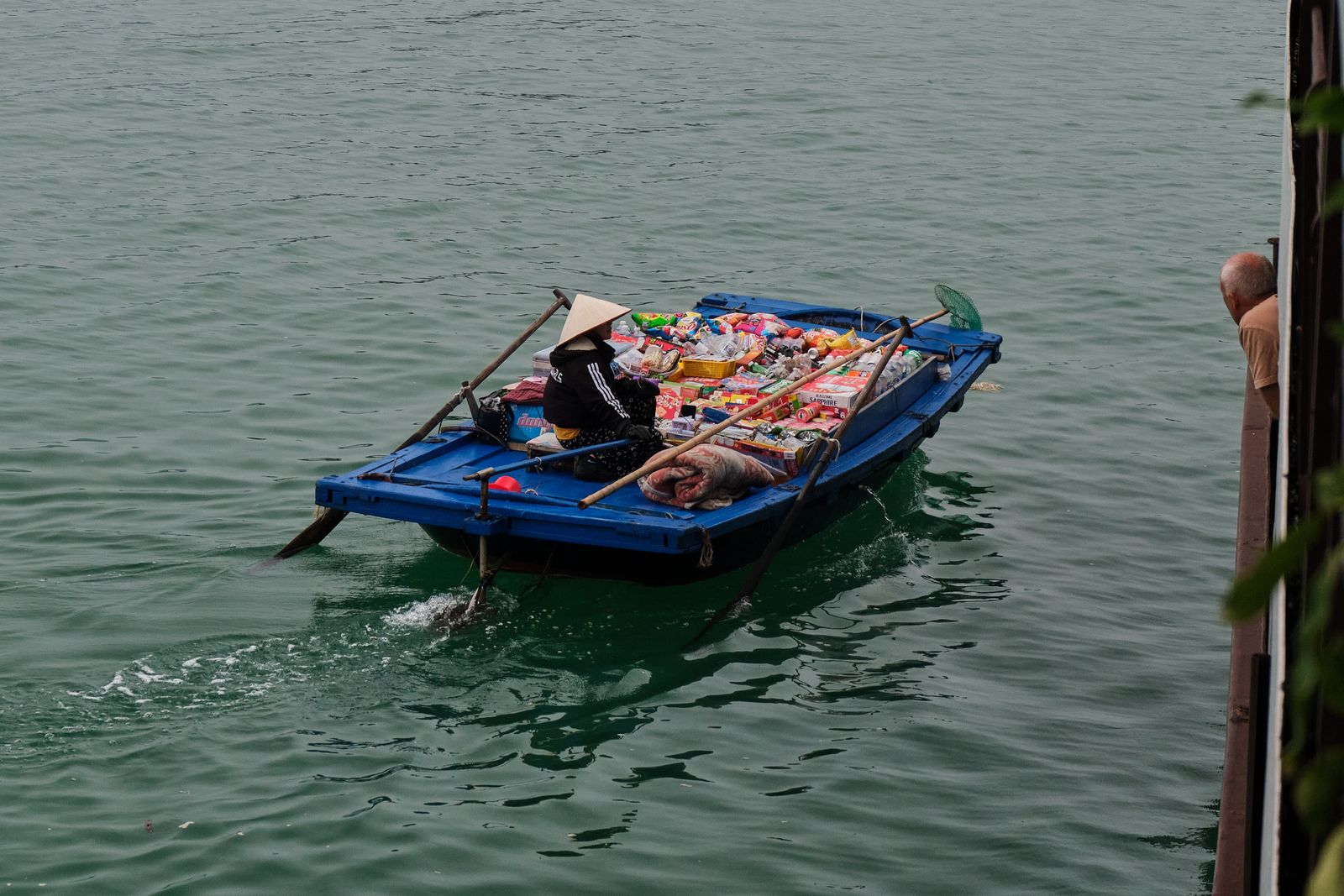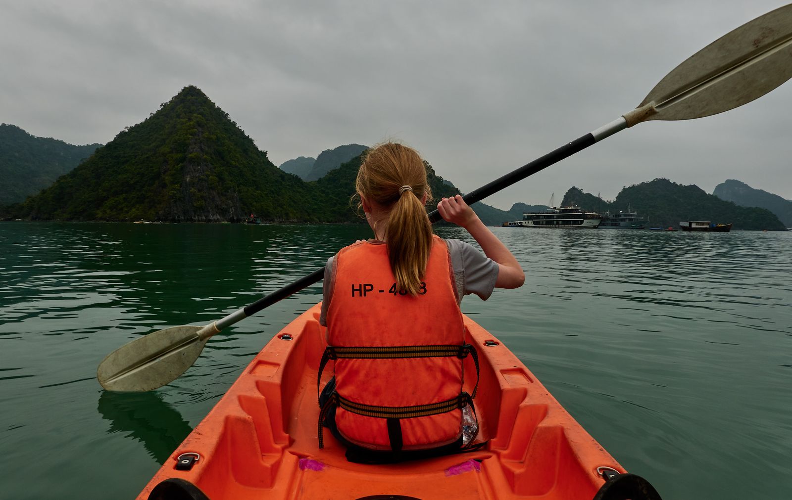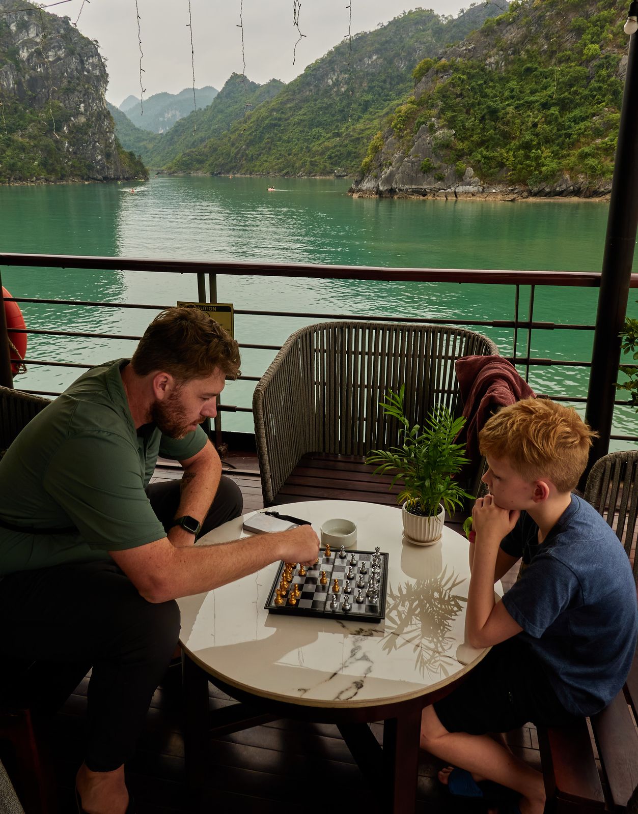 Once we got on board, Mylène and Emma went kayaking between the karsts while Teddy and I stayed behind to supervise from the hot tub and play chess.